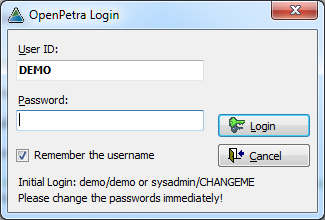 Open Petra. To do this, find the Petra icon (or symbol) on the computer screen, point to it with the mouse, and double-click. The programme loads, and after a few seconds, the Petra Login Screen appears: