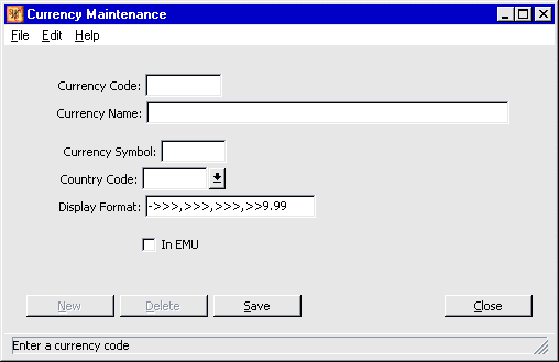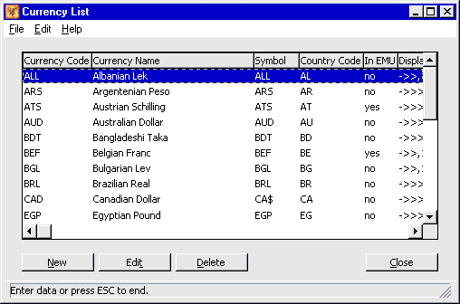 To create a new currency, select New . To edit a currency, highlight it and select Edit . In either case the Currency Maintenance Screen appears. (To delete a currency, see note at the end of this section.)