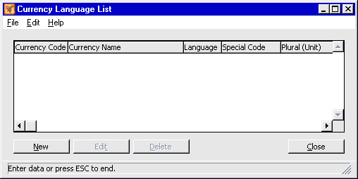 EditthenLanguage Options. The Currency Language List Screen appears:Currency Language List Screen