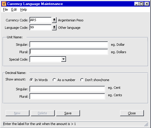 Select New . The Currency Language Maintenance Screen appears: