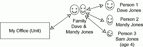 Figure 1-2 David and Mandy Jones have individual Person records linked to a joint Family record (and so does Sam.) |
