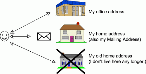 We must record a partner's address , so that we know how to contact them. However, they may have more than one address - for example a private address and an office address. Petra stores addresses separately from partners, and calls them locations . One partner can have several address locations. However, we need to know which address to send any mail to, and so we make one address the Mailing Address .